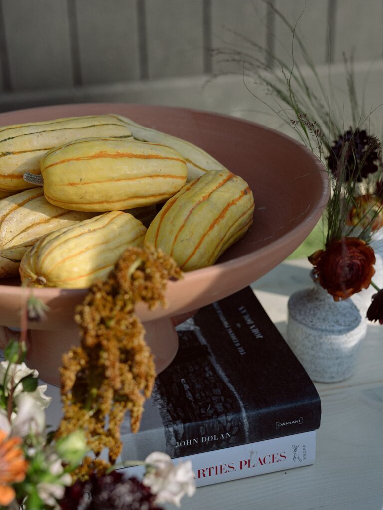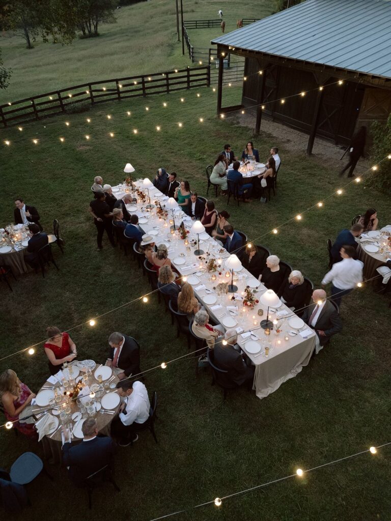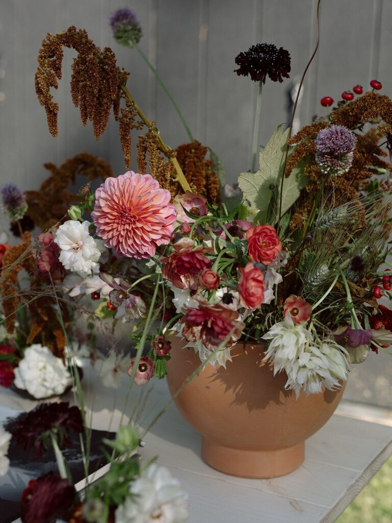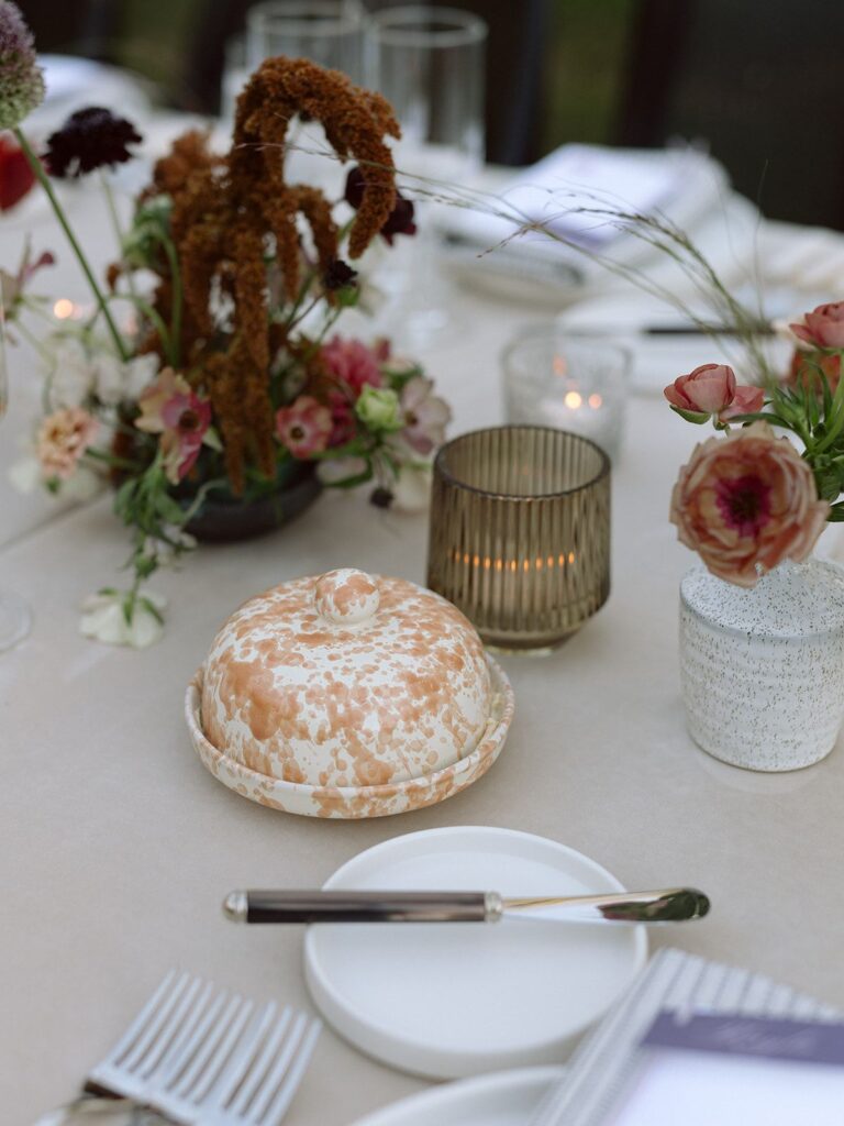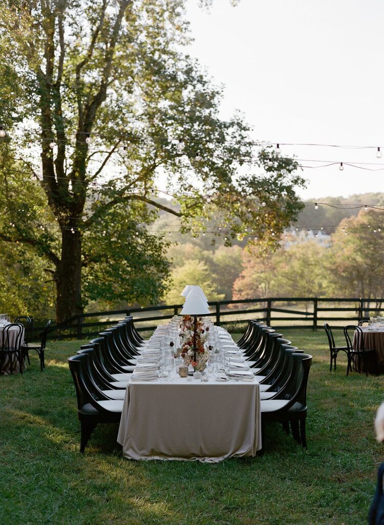 To balance the barn’s warm wood tones, we layered in black as a grounding color. The result was a warm, cozy setting with just the right touch of drama — a fall aesthetic that felt entirely theirs.