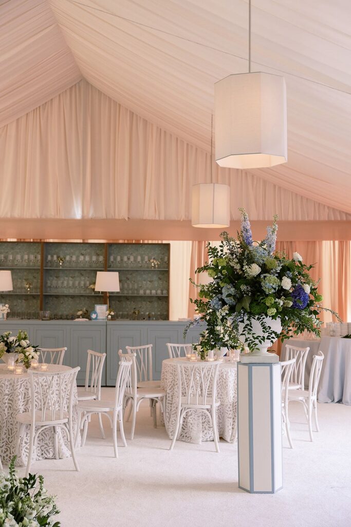 Held on the lawn at Castle Hill in Oxford, the reception took place beneath a custom-designed tent. With inspiration drawn from high-end residential interiors, we brought in the works! From custom table skirts and pillows to designer lighting and pedestals, every detail was intentional.