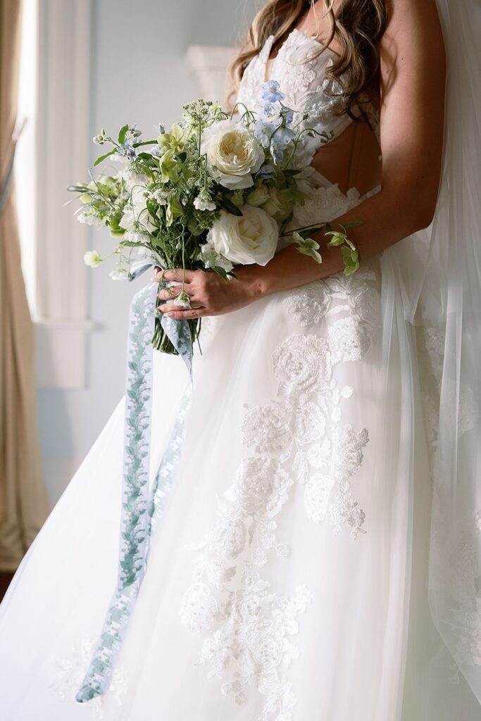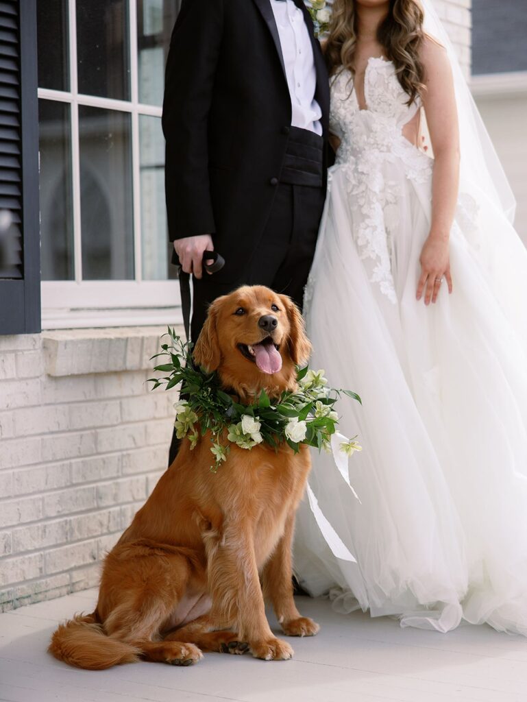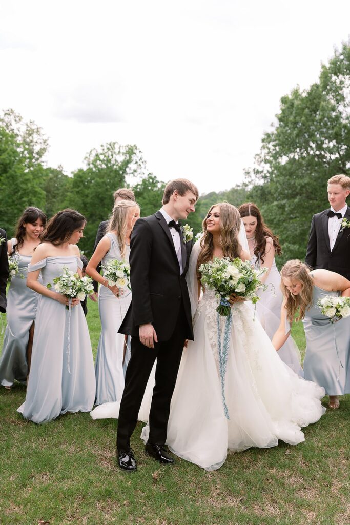 Savannah wore a dreamy Galia Lahav gown with a soft and flowy skirt, a structured bodice, and peek-a-boo side cutouts. Her bridesmaids wore mismatched soft blue gowns, while Brayden and his groomsmen kept it timeless in black tuxedos. The overall wedding party style set the tone for the sophisticated but approachable feel of the entire day. Oh, and their pup rocked a floral wreath to match Savannah’s bouquet!